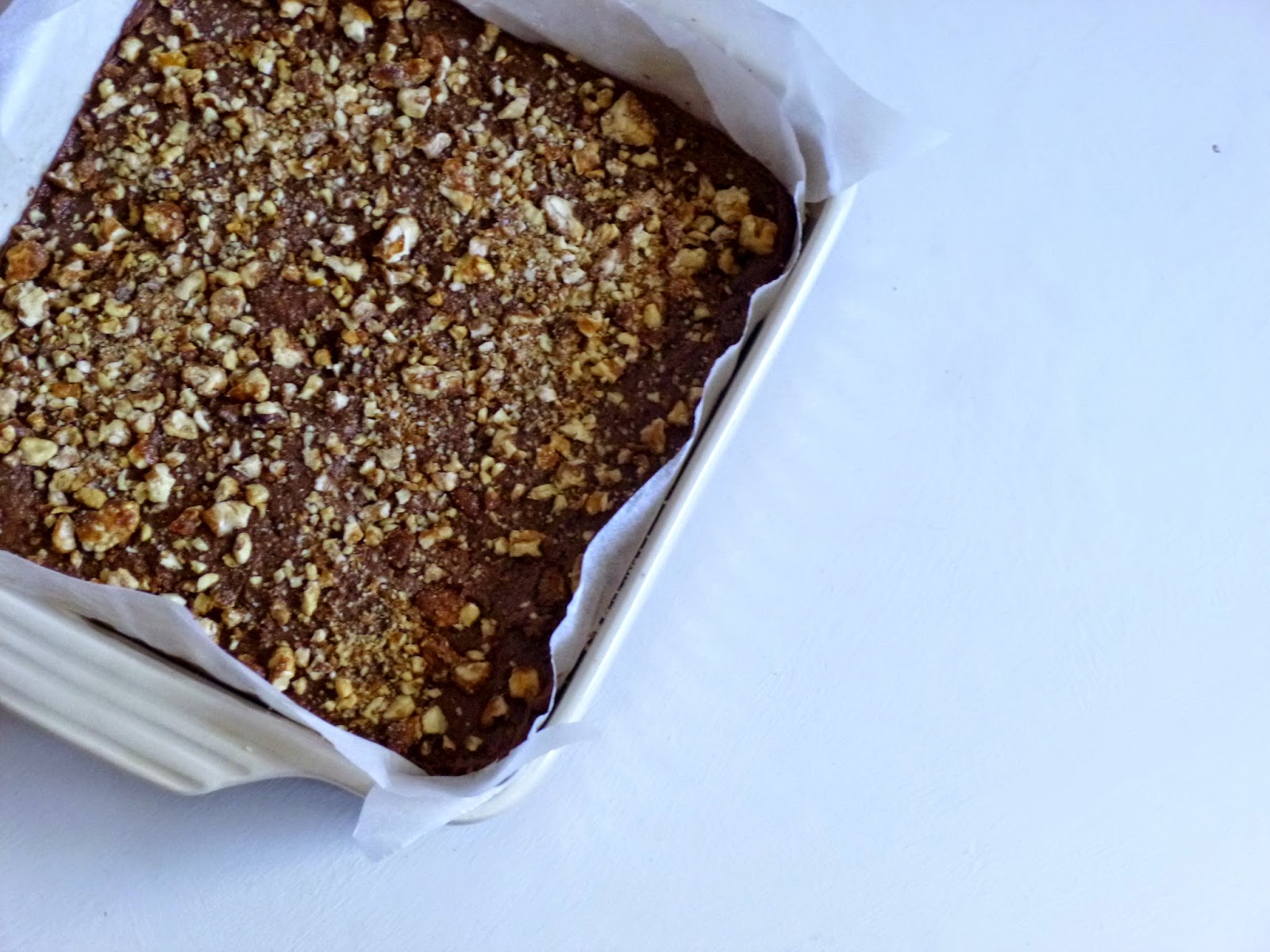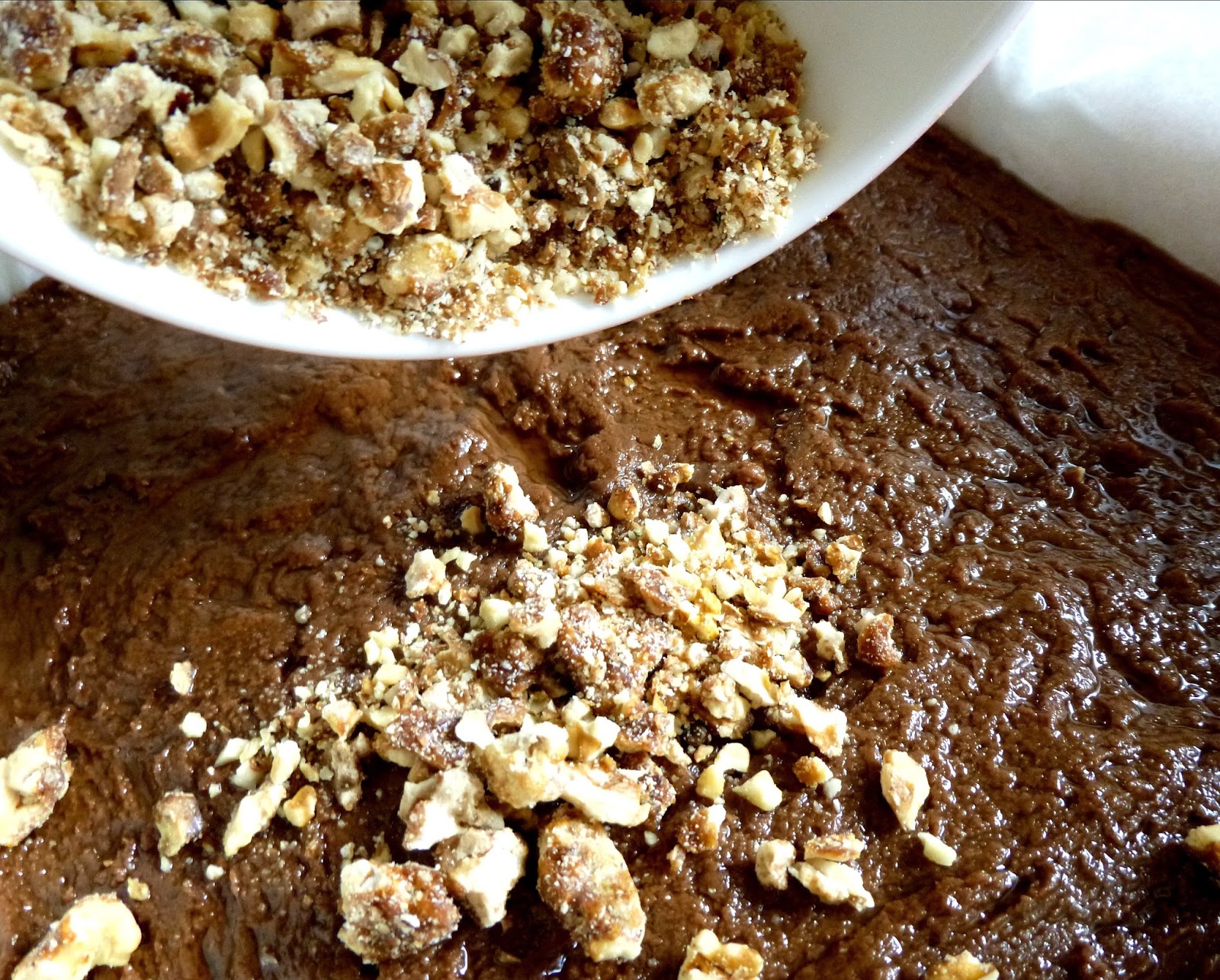 Then take the mixture off the heat and put in the chocolate, keep stirring until all the chocolate has melted. Pour into the lined tin and pat down into all corners and smooth out. Crush up your caramelized walnuts into rough uneven pieces (you don't want a fine powder). Sprinkle the nuts over the fudge and pat down so it just sticks.