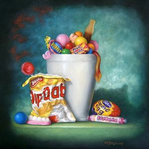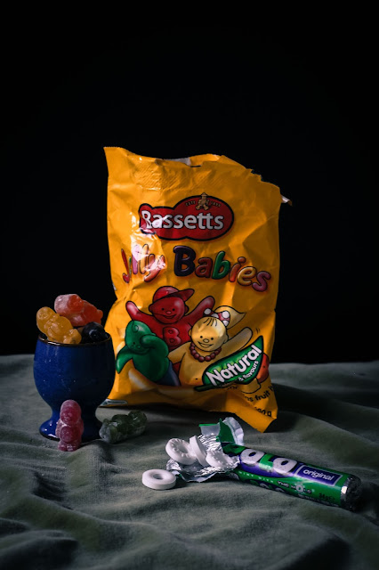I believe the photos are like a historic reference too, food packaging is constantly evolving and as new products enter the market, sadly the old disappears. There's also an element of irony and satire within these pictures. There used to be a real focus on ingredients, fresh apples for example, which the great master Cezanne was arguably most profound for, but now the focus is all about the branding and packaging. The sweets depicting a symbol of consumer society today.